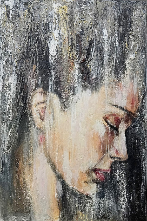 Obra en técnica mixta con acrílico que representa un retrato femenino en perfil, con el rostro inclinado y los ojos cerrados, transmitiendo introspección y serenidad. La textura densa y las capas superpuestas de pintura generan un contraste entre la suavidad del rostro y la fuerza del fondo, evocando la lucha entre lo interno y lo externo. Los matices grises, ocres y blancos envuelven la figura, reforzando la sensación de calma en medio del caos. Una pieza que fusiona realismo y abstracción para invitar a la contemplación silenciosa.