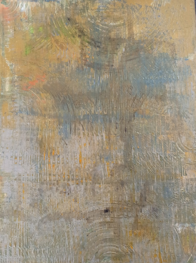 Pintura abstracta de textura densa, casi táctil, donde las capas se superponen como huellas del tiempo. Predominan los ocres, grises azulados y toques apagados de verde y óxido, creando una atmósfera terrosa y contemplativa. Las marcas curvas y las estrías recuerdan a corrientes lentas, como si algo hubiera sido arrastrado y luego dejado en calma. No hay un centro claro: la mirada se mueve, se pierde y vuelve, como explorando una pared erosionada o un paisaje visto a través de la memoria.