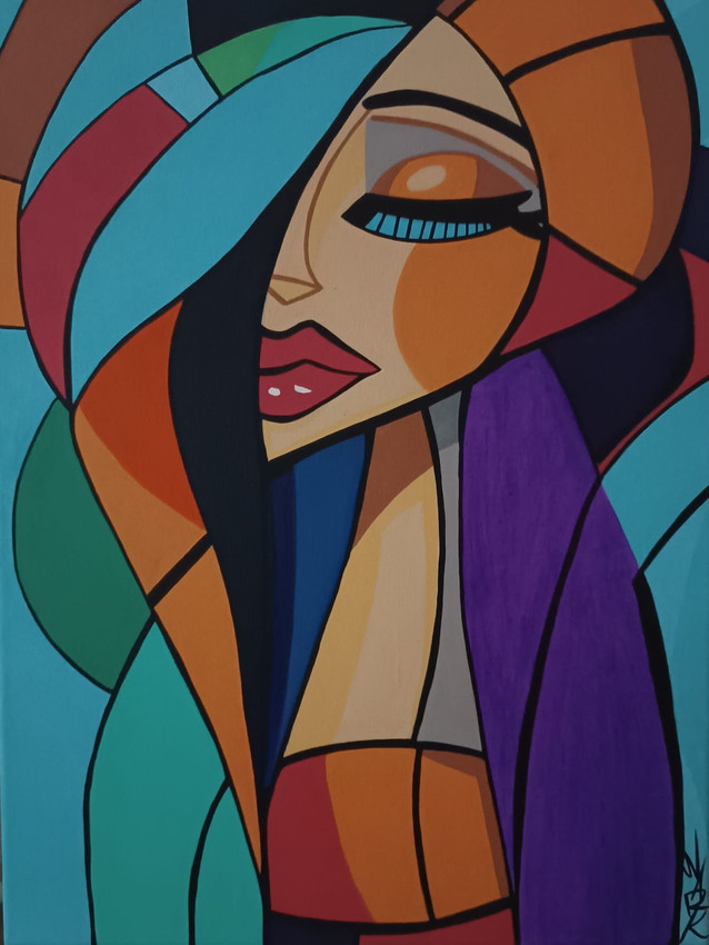 "Sinfonía de Identidad es un retrato lírico donde la figura femenina se fusiona con su entorno en un estallido de color. La mitad del rostro, sutilmente cubierta por un manto naranja, azul, rojo y verde, invita a reflexionar sobre la dualidad de lo que mostramos y lo que ocultamos. Los colores intensos no solo cubren, sino que revelan una personalidad vibrante, transformando el misterio en una celebración de la propia esencia."