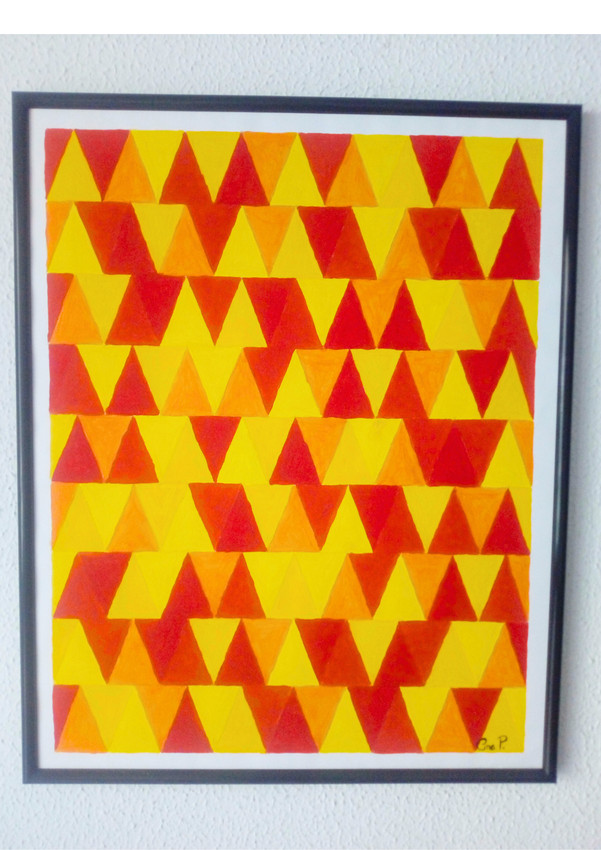 Cuadro geométrico, de triángulos en todos cálidos, Pintado en acrílico. No se vende enmarcado