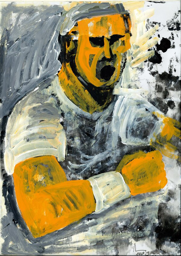 TENIS 05 pertenece a la serie Tenis 2025 que está realizada con técnicas propias de la pintura de acción. En papel pegado sobre cartulina, se utiliza la proyección de esmaltes, la transferencia por presión, la impresión de papel sobre papel...