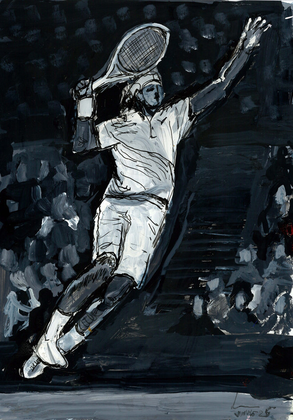 TENIS 09 dialoga con otras piezas de la serie Tenis 2025, en particular TENIS 08 por temática y dimensiones.
