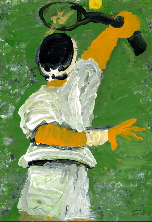 TENIS 10 pertenece a la serie Tenis 2025 que está realizada con técnicas propias de la pintura de acción. En papel pegado sobre cartulina, se utiliza la proyección de esmaltes, la transferencia por presión, la impresión de papel sobre papel...