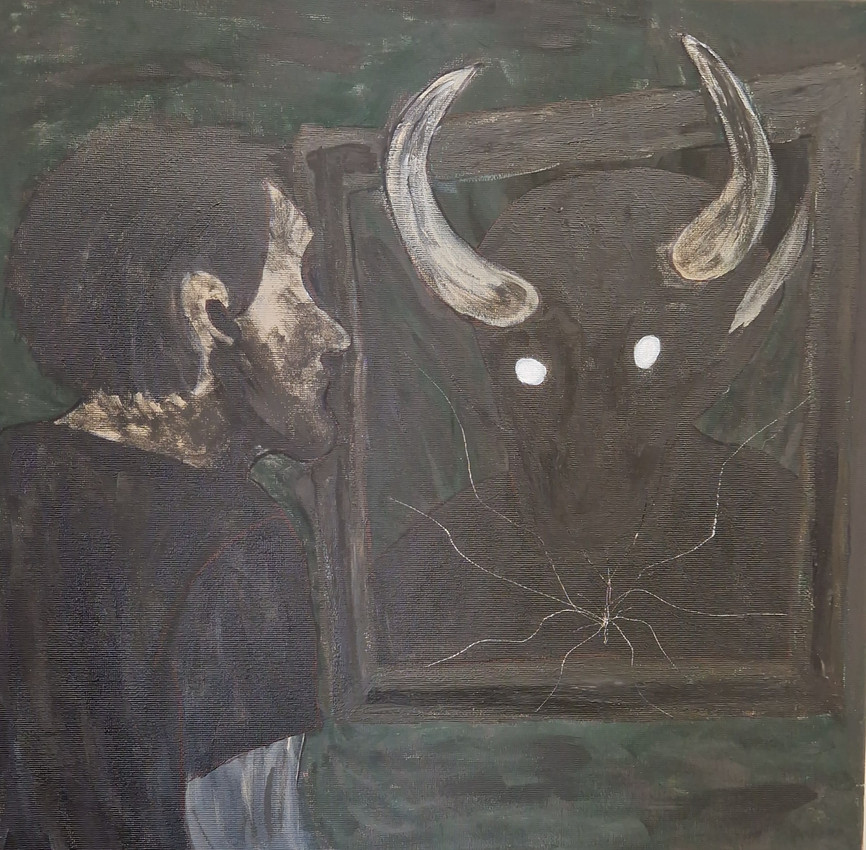 Original hand-painted canvas that explores the confrontation with our inner demons. The artwork depicts a figure looking into a mirror, only to see a horned shadow staring back — a raw metaphor for fear, self-doubt, and hidden struggles. Dark tones, broken glass details, and haunting symbolism make this piece a striking statement for contemporary art lovers.