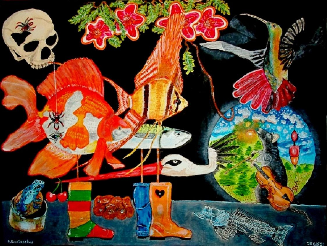 La obra mezcla elementos orgánicos, objetos cotidianos y animales en una composición imposible, creando una atmósfera de fantasía, introspección y humor visual. El contraste entre el fondo negro y los colores intensos potencia la sensación de un mundo propio, simbólico y lleno de detalles que invitan a la interpretación personal.