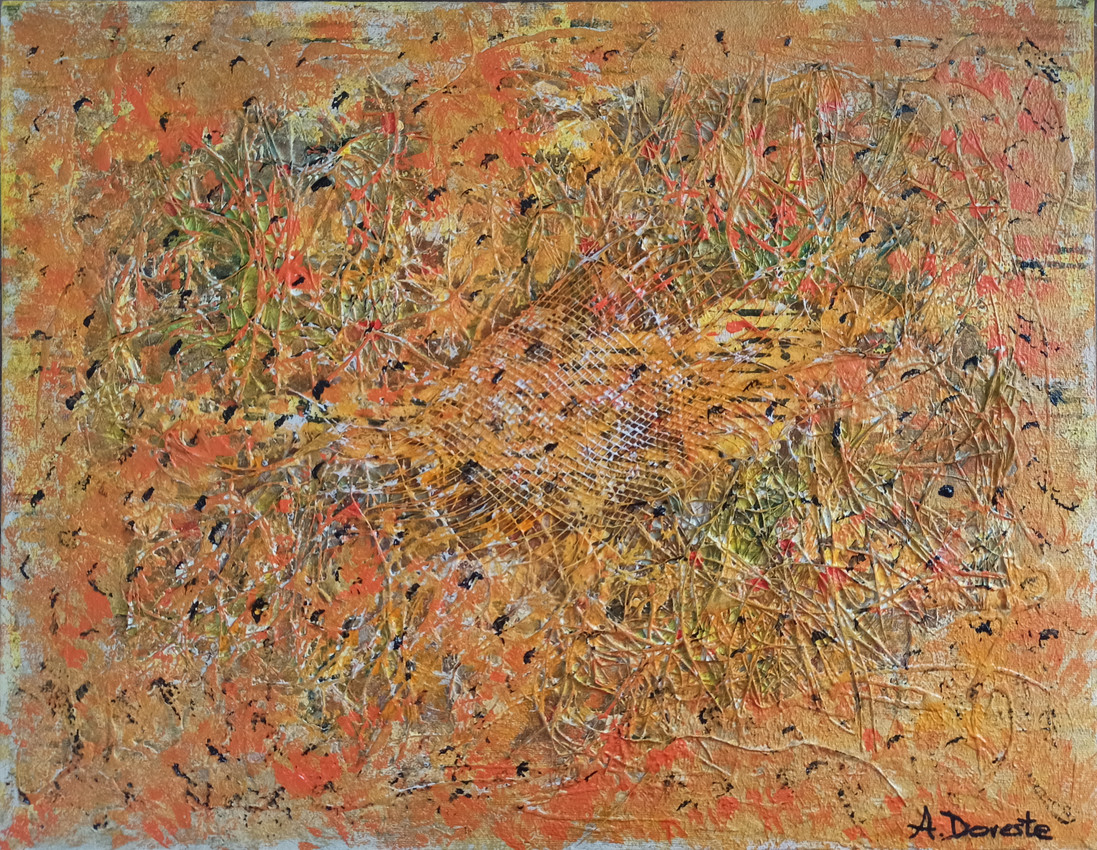 La obra presenta una composición abstracta dominada por tonos cálidos que evocan tierra, fuego y materia orgánica. En el centro, una trama entrecruzada de redes irradian líneas y gestos en todas direcciones. Las pinceladas enérgicas y superpuestas, con salpicaduras oscuras aportan ritmo y tensión visual.