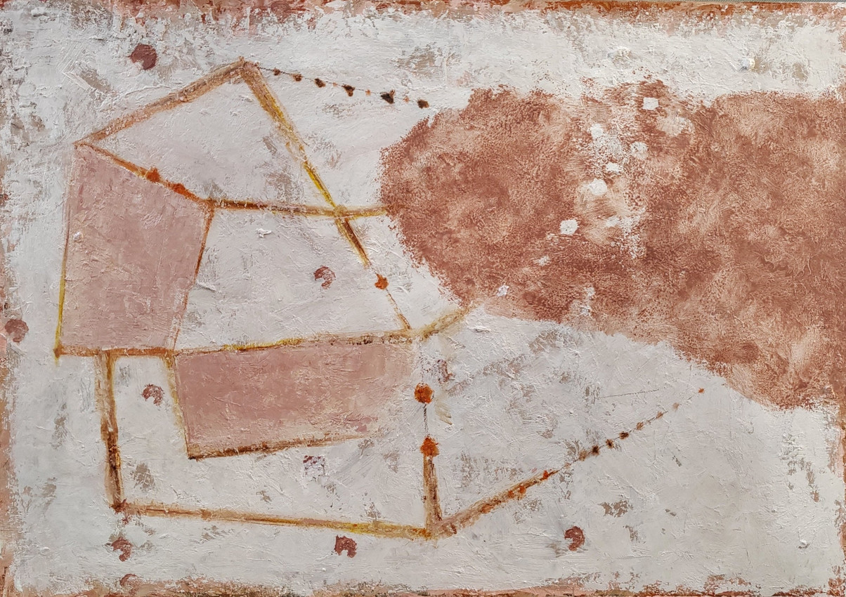 "Verbena con nube", es un ejercicio de equilibrio entre la fragilidad geométrica y la rotundidad de la materia. El soporte rígido permite jugar con una textura casi arqueológica, donde las capas de pintura parecen haber sido rescatadas de un muro antiguo.
