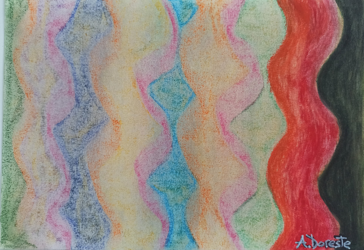 La imagen muestra una composición abstracta realizada con colores suaves y líneas ondulantes verticales que recorren todo el lienzo. Estas líneas serpenteantes crean una sensación de movimiento continuo, como si fueran ondas de energía o flujos de agua que se entrelazan entre sí. Los colores van desde tonos fríos —azules, verdes y lilas— hasta cálidos —naranjas, amarillos y rojos intensos—, generando un equilibrio visual entre serenidad y vitalidad.