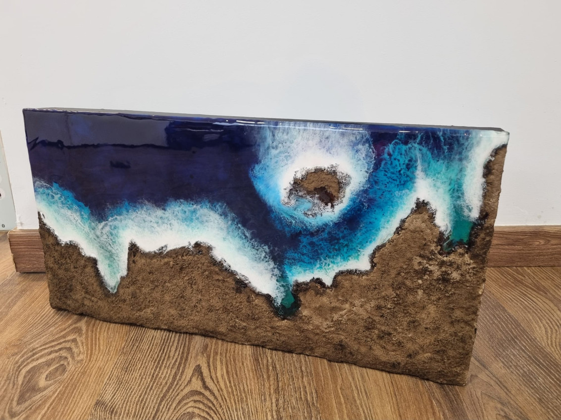 La pieza recrea una visión abstracta del encuentro entre el océano y la tierra, donde las transparencias de la resina generan sensación de movimiento y profundidad, mientras los relieves aportan carácter escultórico y presencia física.